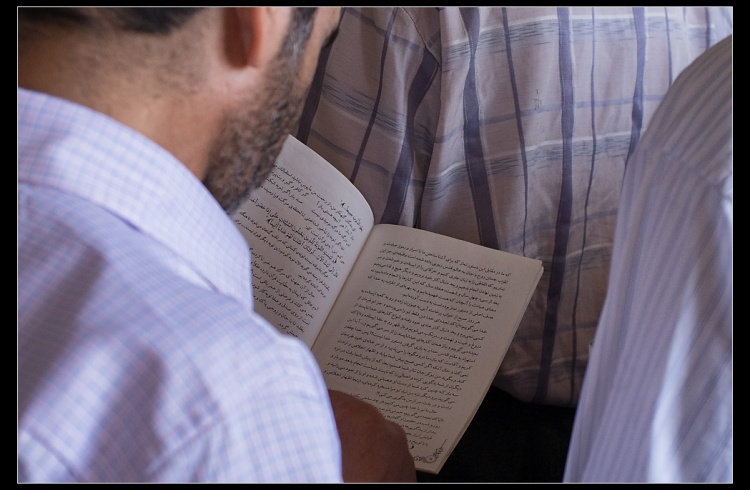 Reading holy book can be done everywhere, even in the queue
